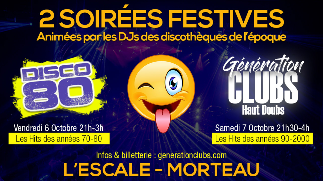 L’US Les Fins s’unit avec l’association Génération Clubs pour proposer 2 soirées dansantes aux sons des années 70-80 et 90-2000 vendredi 6 et samedi 7 octobre à Morteau, centre culturel l’Escale.