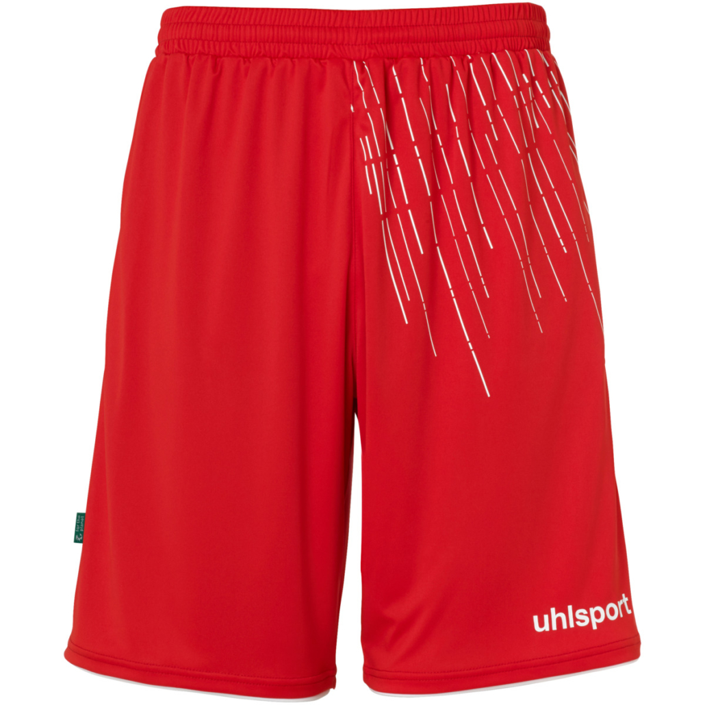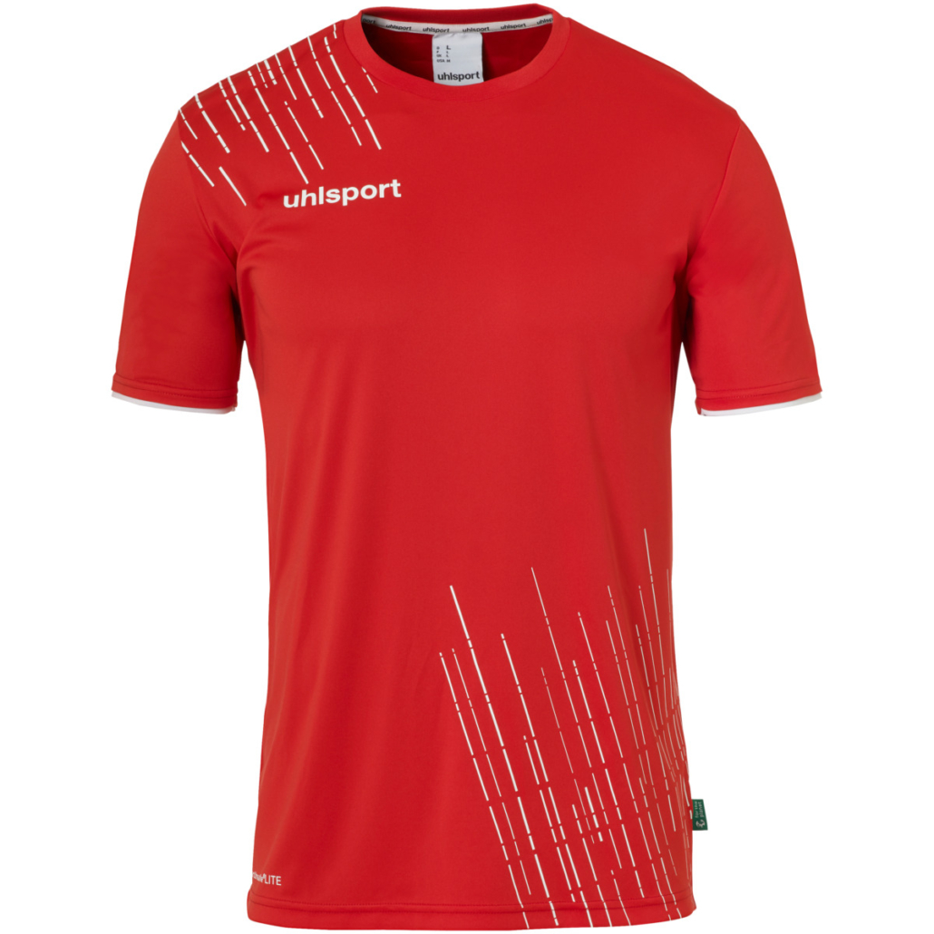 Ensemble T-shirt et Short d’entraînement uhlsport, couleur rouge et blanc, 100% polyester recyclé.